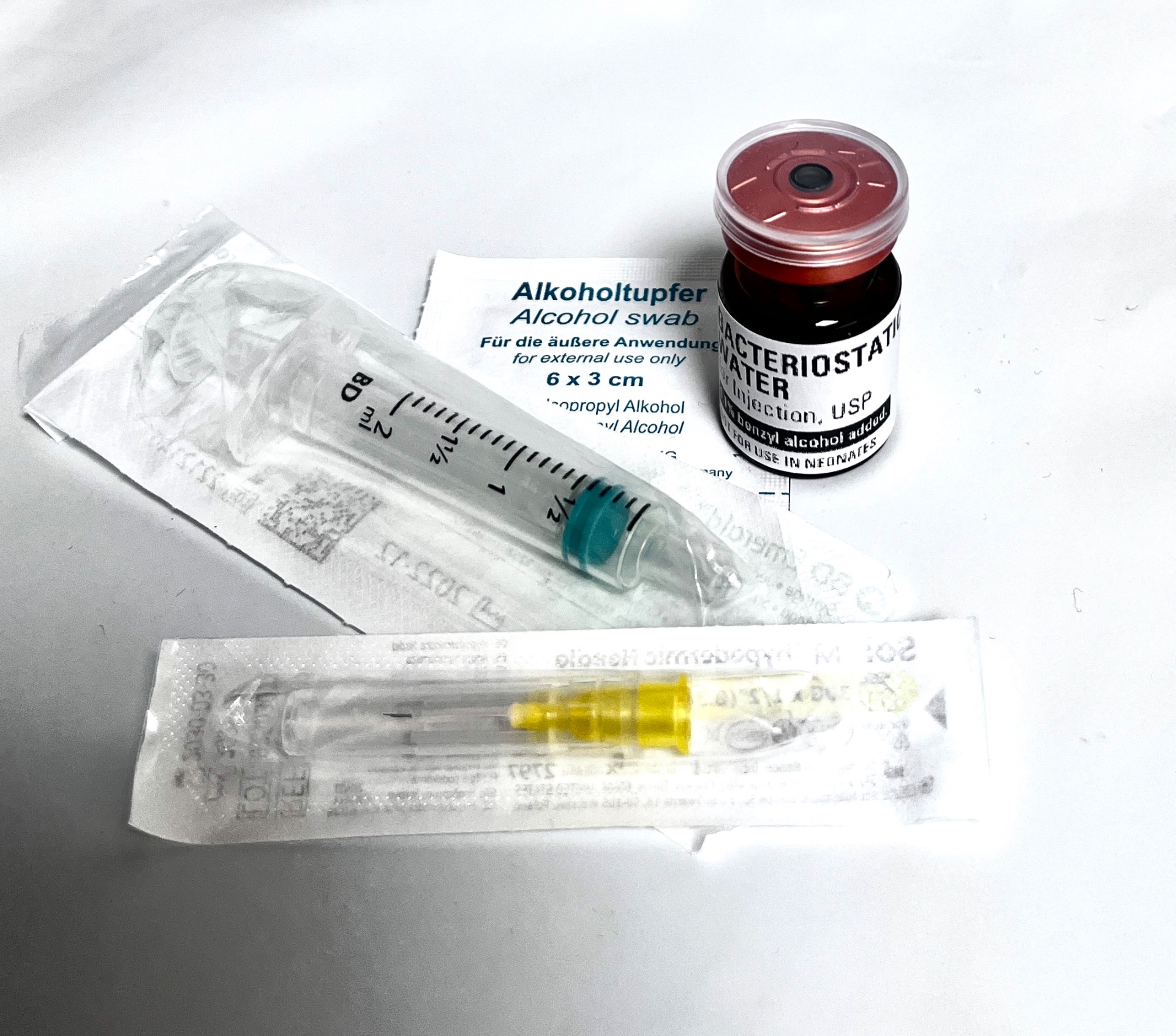 Injektionskit innehållande 5 Bd Emerald 2ml sprutor, kanyler samt 5 ml bacvatten